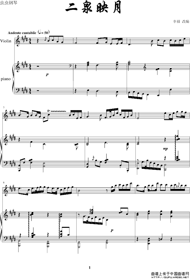 温馨提示:想要保存二泉映月(幸福改编版)钢琴谱,改编后尽显别样情 二泉映月(幸福改编版)钢琴谱,独特改编韵味悠长 二泉映月(幸福改编版)钢琴谱,幸福改编别具一格曲谱?在曲谱图片上单击右键,选择"图片另存为...",即可将该曲谱保存到您的电脑本地,想要打印出来?将图片插入到WORD中,调整合适到大小打印即可。