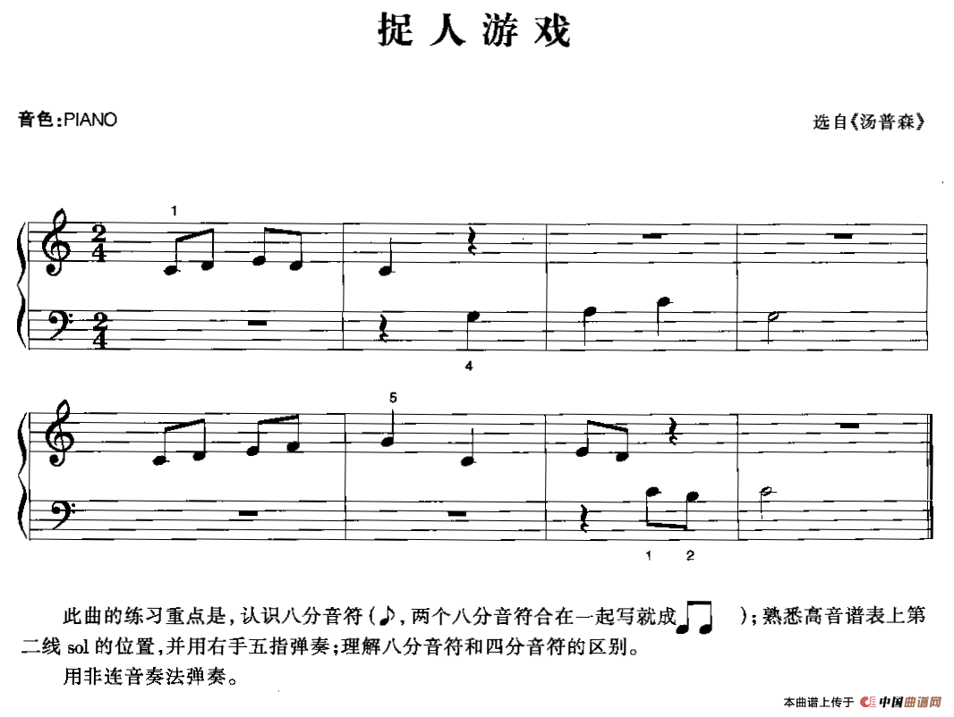 温馨提示:想要保存捉人游戏电子琴谱,趣味十足的曲调曲谱?在曲谱图片上单击右键,选择"图片另存为...",即可将该曲谱保存到您的电脑本地,想要打印出来?将图片插入到WORD中,调整合适到大小打印即可。