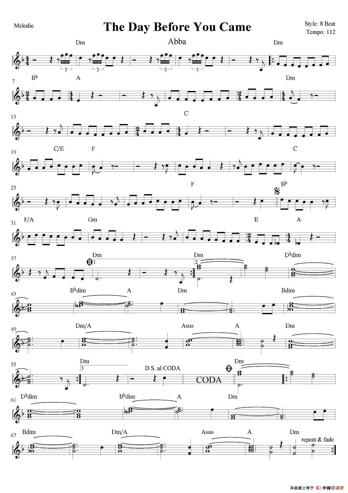 温馨提示:想要保存TheDayBeforeYouCame电子琴谱,歌曲前奏轻柔舒缓曲谱?在曲谱图片上单击右键,选择"图片另存为...",即可将该曲谱保存到您的电脑本地,想要打印出来?将图片插入到WORD中,调整合适到大小打印即可。