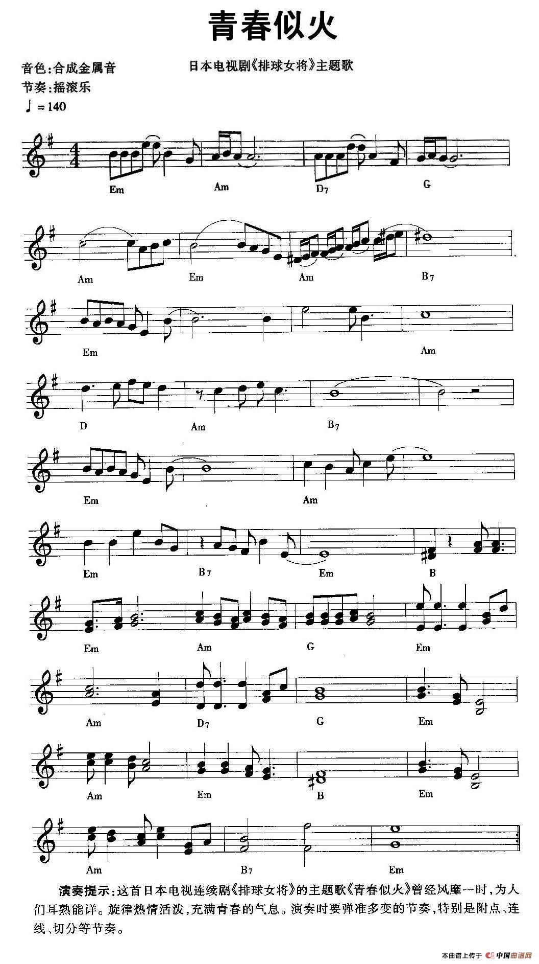 温馨提示:想要保存青春似火,展现青春活力,曲谱?在曲谱图片上单击右键,选择"图片另存为...",即可将该曲谱保存到您的电脑本地,想要打印出来?将图片插入到WORD中,调整合适到大小打印即可。