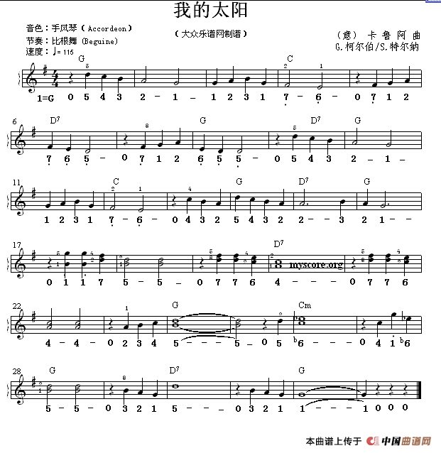 温馨提示:想要保存《我的太阳(线简谱混排版)》电子琴谱,经典咏叹炽热阳光曲谱?在曲谱图片上单击右键,选择"图片另存为...",即可将该曲谱保存到您的电脑本地,想要打印出来?将图片插入到WORD中,调整合适到大小打印即可。
