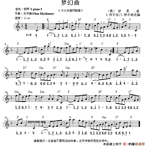 温馨提示:想要保存梦幻曲(线简谱混排版)电子琴谱,经典轻柔的旋律 《梦幻曲(线简谱混排版)》电子琴谱,演绎纯真梦幻意境 《梦幻曲(线简谱混排版)》电子琴谱,感受温柔舒缓曲调曲谱?在曲谱图片上单击右键,选择"图片另存为...",即可将该曲谱保存到您的电脑本地,想要打印出来?将图片插入到WORD中,调整合适到大小打印即可。