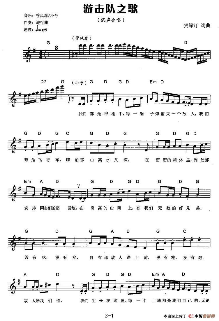 温馨提示:想要保存游击队之歌弹唱谱,激昂展现游击岁月 游击队之歌弹唱谱,重温经典战斗旋律 游击队之歌弹唱谱,领略游击战斗豪情曲谱?在曲谱图片上单击右键,选择"图片另存为...",即可将该曲谱保存到您的电脑本地,想要打印出来?将图片插入到WORD中,调整合适到大小打印即可。