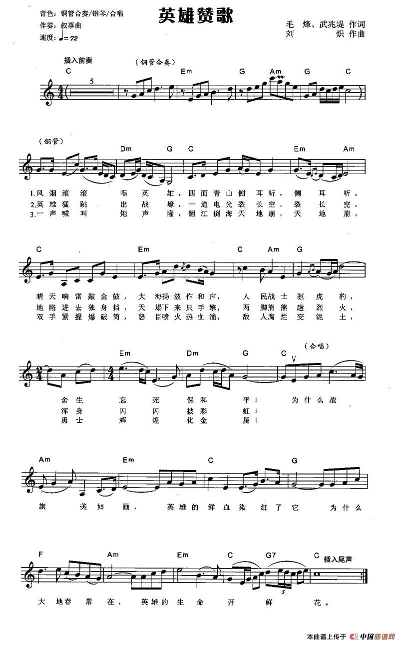 温馨提示:想要保存英雄赞歌弹唱谱,激昂歌颂英雄情曲谱?在曲谱图片上单击右键,选择"图片另存为...",即可将该曲谱保存到您的电脑本地,想要打印出来?将图片插入到WORD中,调整合适到大小打印即可。
