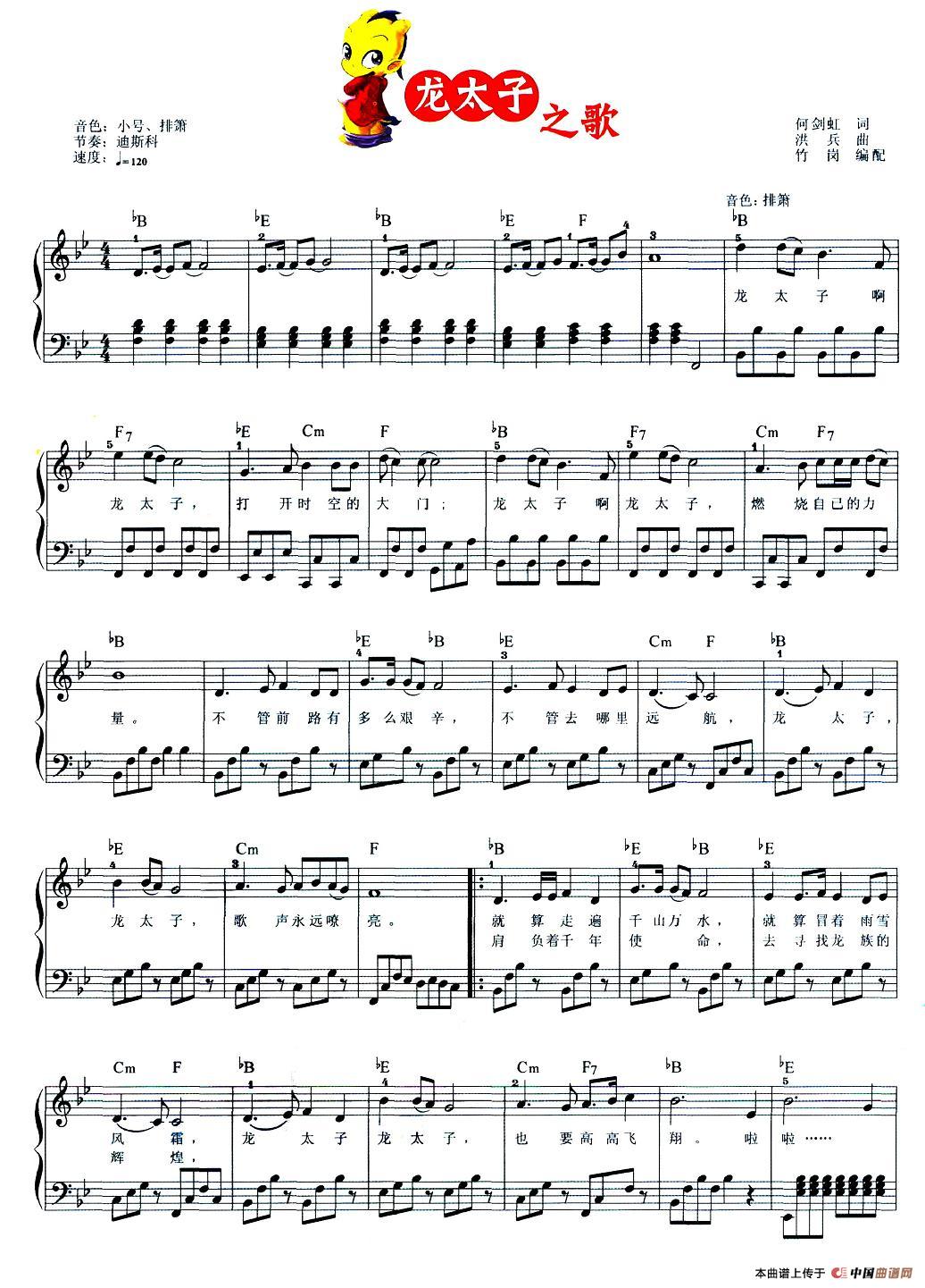 温馨提示:想要保存龙太子之歌弹唱谱,展现别样风采曲谱?在曲谱图片上单击右键,选择"图片另存为...",即可将该曲谱保存到您的电脑本地,想要打印出来?将图片插入到WORD中,调整合适到大小打印即可。