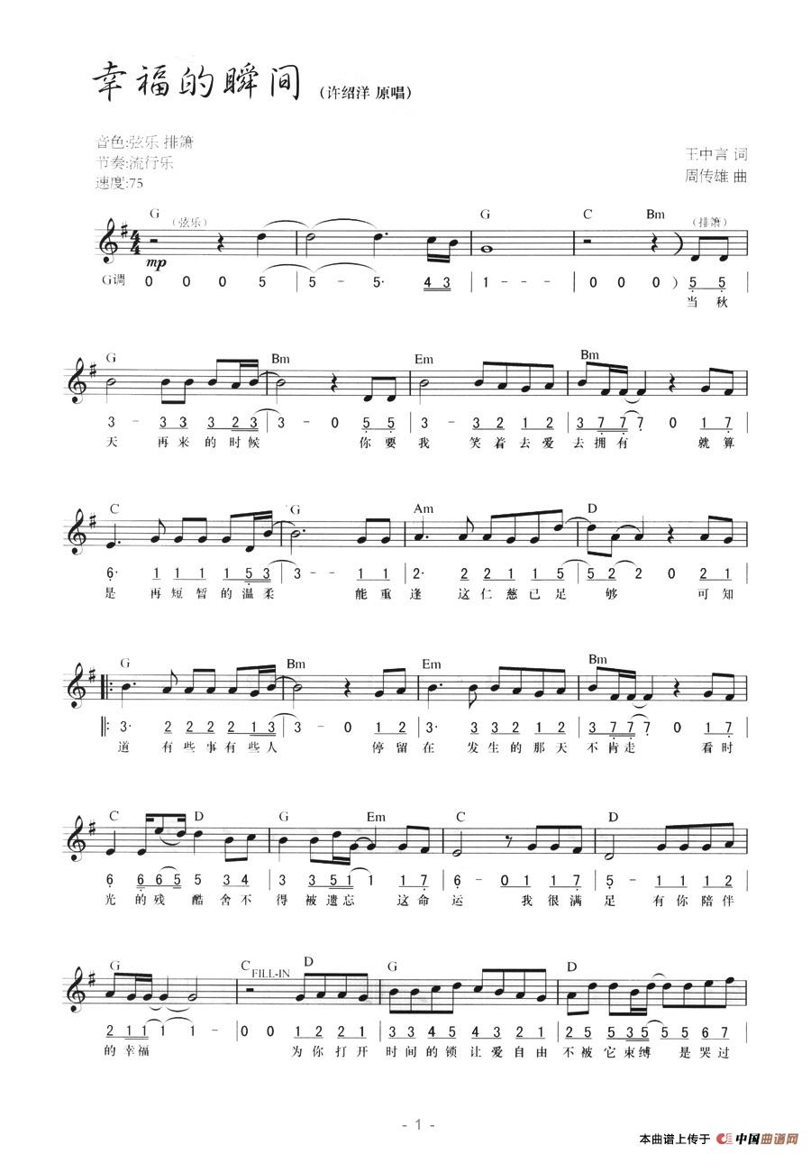 温馨提示:想要保存幸福瞬间,爱意在蔓延, 幸福瞬间,美好永留存, 幸福瞬间,温暖常相伴, 幸福瞬间,情感在流淌, 幸福瞬间,甜蜜满心间, 幸福瞬间,回忆亦珍贵, 幸福瞬间,旋律诉深情, 幸福瞬间,温馨如暖阳, 幸福瞬间曲谱?在曲谱图片上单击右键,选择"图片另存为...",即可将该曲谱保存到您的电脑本地,想要打印出来?将图片插入到WORD中,调整合适到大小打印即可。