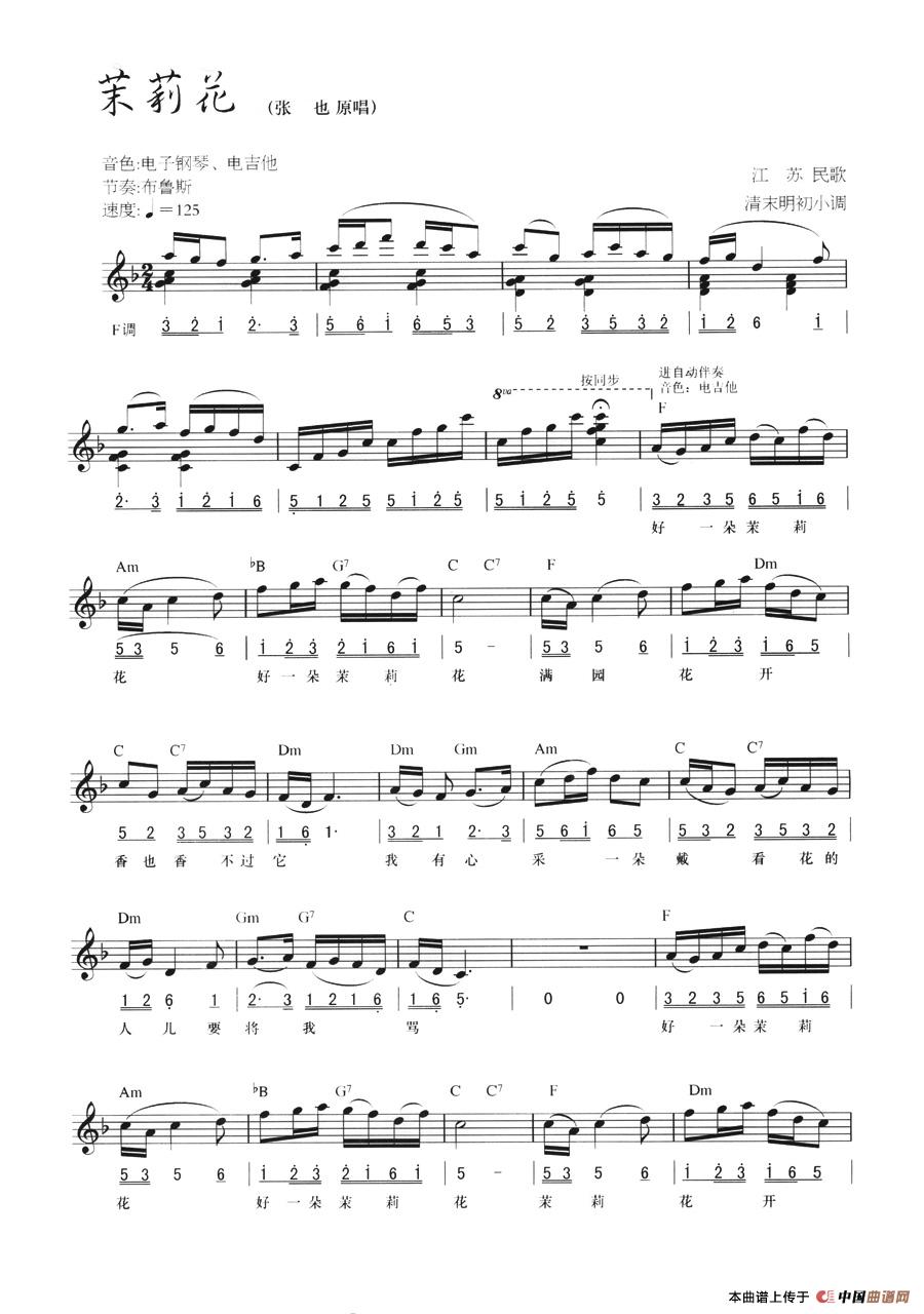 温馨提示:想要保存茉莉花线简混排弹唱谱,经典民歌韵味足曲谱?在曲谱图片上单击右键,选择"图片另存为...",即可将该曲谱保存到您的电脑本地,想要打印出来?将图片插入到WORD中,调整合适到大小打印即可。