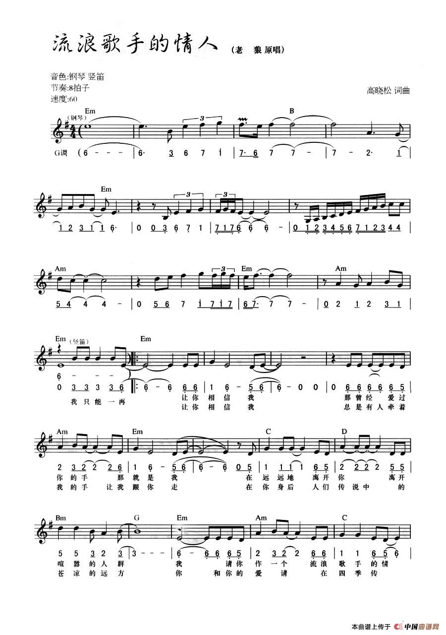 温馨提示:想要保存流浪歌手的情人弹唱谱,诉说流浪爱情故事曲谱?在曲谱图片上单击右键,选择"图片另存为...",即可将该曲谱保存到您的电脑本地,想要打印出来?将图片插入到WORD中,调整合适到大小打印即可。