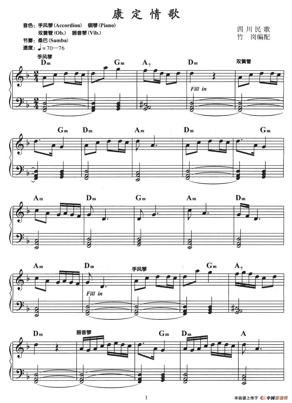 温馨提示:想要保存《康定情歌》电子琴谱,经典情歌韵味浓 《康定情歌》电子琴谱,展现康定的风情 《康定情歌》电子琴谱,旋律优美情意长曲谱?在曲谱图片上单击右键,选择"图片另存为...",即可将该曲谱保存到您的电脑本地,想要打印出来?将图片插入到WORD中,调整合适到大小打印即可。