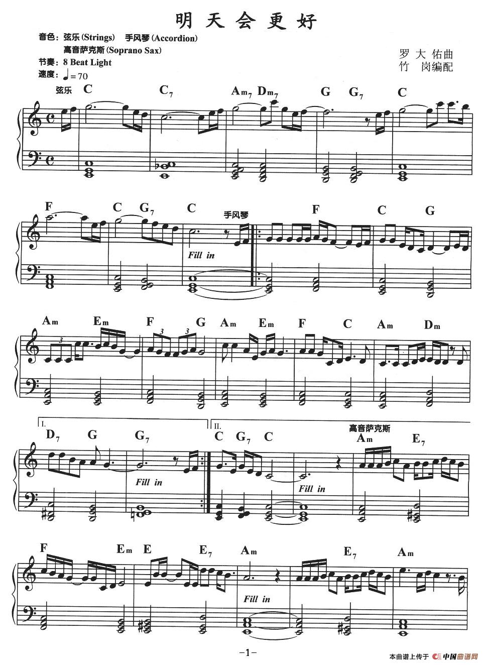 温馨提示:想要保存明天会更好电子琴谱,温暖治愈经典之作 明天会更好电子琴谱,传递美好未来期许 明天会更好电子琴谱,激励人心的旋律曲曲谱?在曲谱图片上单击右键,选择"图片另存为...",即可将该曲谱保存到您的电脑本地,想要打印出来?将图片插入到WORD中,调整合适到大小打印即可。