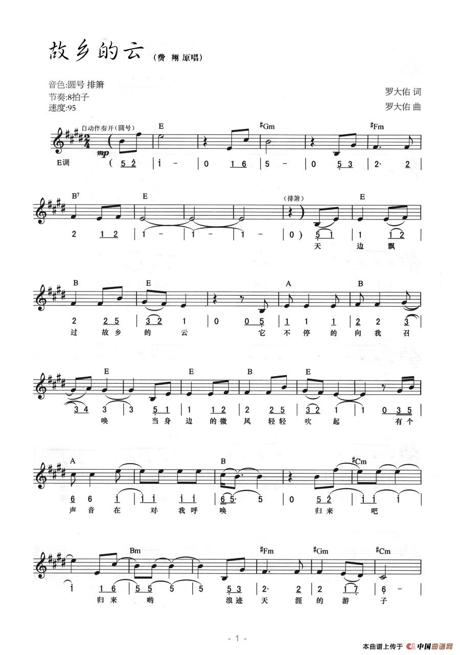 温馨提示:想要保存故乡的云,游子思乡曲, 故乡的云,勾起故园情, 故乡的云,饱含眷恋意, 故乡的云,承载相思愁, 故乡的云,倾诉归乡情, 故乡的云,唱出思乡愁, 故乡的云,演绎游子情, 故乡的云,传递眷恋心, 故乡的云曲谱?在曲谱图片上单击右键,选择"图片另存为...",即可将该曲谱保存到您的电脑本地,想要打印出来?将图片插入到WORD中,调整合适到大小打印即可。
