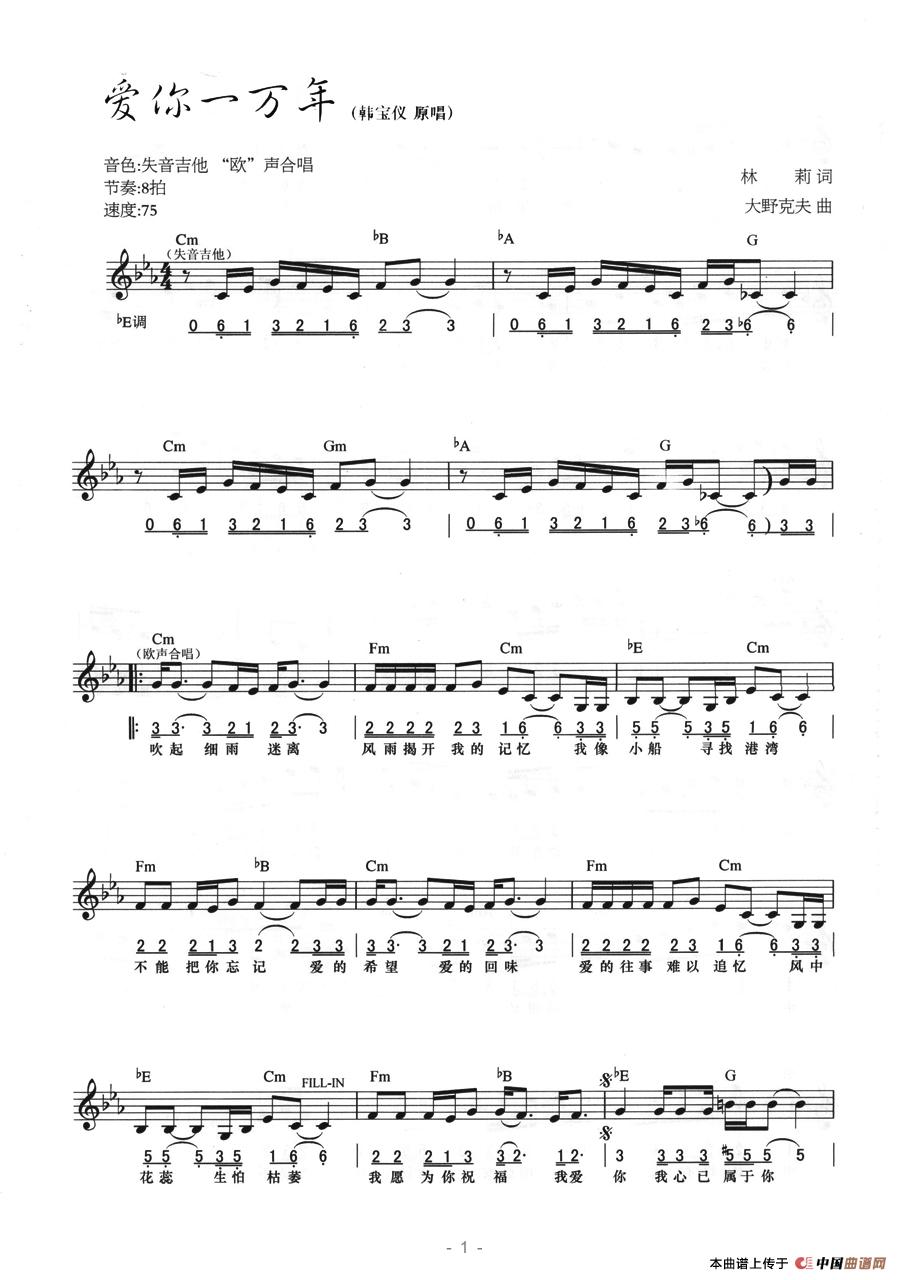 温馨提示:想要保存爱你一万年,经典永恒曲, 爱你一万年,深情永流传, 爱你一万年,爱意满心间, 爱你一万年,浪漫之乐章, 爱你一万年,情牵岁月长, 爱你一万年,真爱永不朽, 爱你一万年,歌声诉衷肠, 爱你一万年,旋律动曲谱?在曲谱图片上单击右键,选择"图片另存为...",即可将该曲谱保存到您的电脑本地,想要打印出来?将图片插入到WORD中,调整合适到大小打印即可。