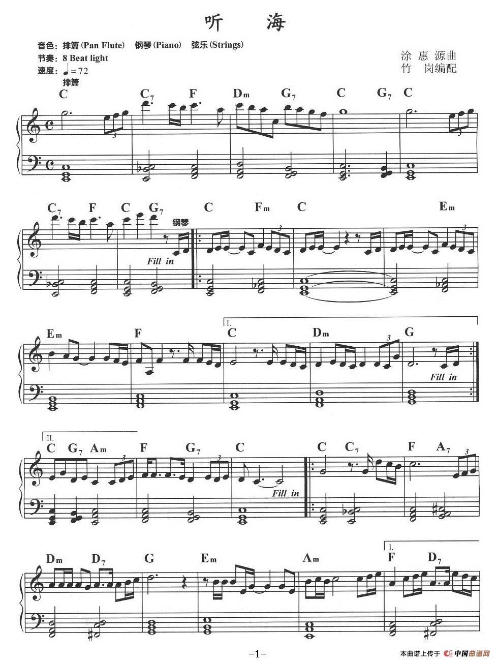 温馨提示:想要保存听海电子琴谱,张惠妹经典之作曲谱?在曲谱图片上单击右键,选择"图片另存为...",即可将该曲谱保存到您的电脑本地,想要打印出来?将图片插入到WORD中,调整合适到大小打印即可。