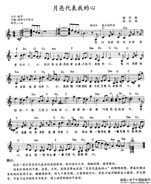 温馨提示:想要保存月亮代表我的心,深情告白经典曲 月亮代表我的心,诠释真挚的情感 月亮代表我的心,传递深深的爱意曲谱?在曲谱图片上单击右键,选择"图片另存为...",即可将该曲谱保存到您的电脑本地,想要打印出来?将图片插入到WORD中,调整合适到大小打印即可。