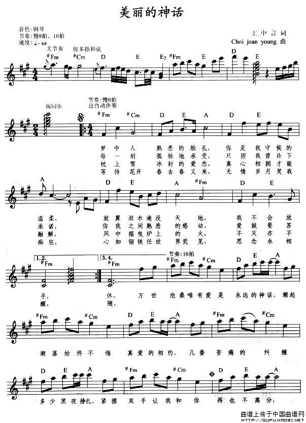 温馨提示:想要保存美丽的神话,凄美爱情曲曲谱?在曲谱图片上单击右键,选择"图片另存为...",即可将该曲谱保存到您的电脑本地,想要打印出来?将图片插入到WORD中,调整合适到大小打印即可。