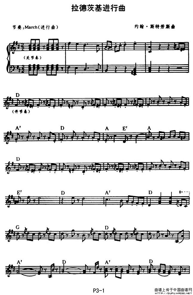 温馨提示:想要保存拉德茨基进行曲(版本二)电子琴谱,激昂节奏振奋人心曲谱?在曲谱图片上单击右键,选择"图片另存为...",即可将该曲谱保存到您的电脑本地,想要打印出来?将图片插入到WORD中,调整合适到大小打印即可。