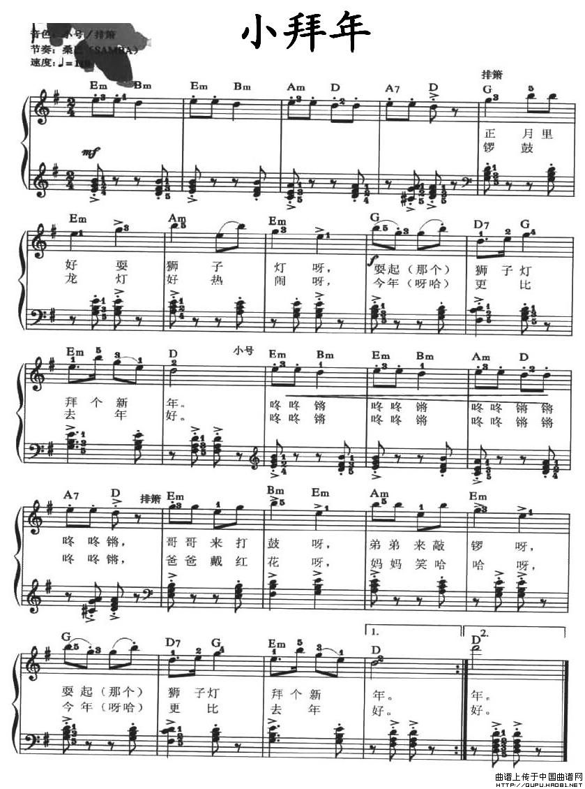 温馨提示:想要保存小拜年弹唱谱,欢快喜庆迎新年曲谱?在曲谱图片上单击右键,选择"图片另存为...",即可将该曲谱保存到您的电脑本地,想要打印出来?将图片插入到WORD中,调整合适到大小打印即可。