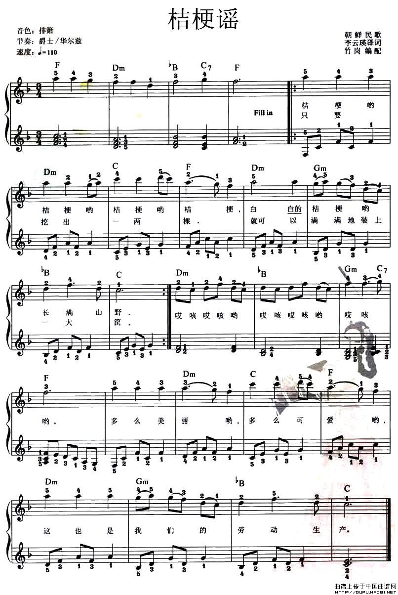 温馨提示:想要保存桔梗谣弹唱谱,民谣韵味浓, 桔梗谣弹唱谱,展现朝鲜风, 桔梗谣弹唱谱,曲调轻快美,曲谱?在曲谱图片上单击右键,选择"图片另存为...",即可将该曲谱保存到您的电脑本地,想要打印出来?将图片插入到WORD中,调整合适到大小打印即可。