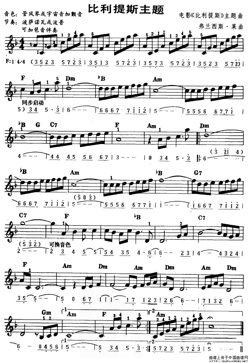 温馨提示:想要保存比利提斯主题电子琴谱,独特主题旋律优美曲谱?在曲谱图片上单击右键,选择"图片另存为...",即可将该曲谱保存到您的电脑本地,想要打印出来?将图片插入到WORD中,调整合适到大小打印即可。