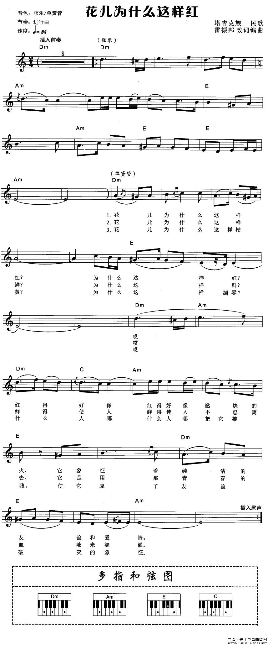 温馨提示:想要保存花儿为什么这样红,经典歌曲弹唱谱曲谱?在曲谱图片上单击右键,选择"图片另存为...",即可将该曲谱保存到您的电脑本地,想要打印出来?将图片插入到WORD中,调整合适到大小打印即可。