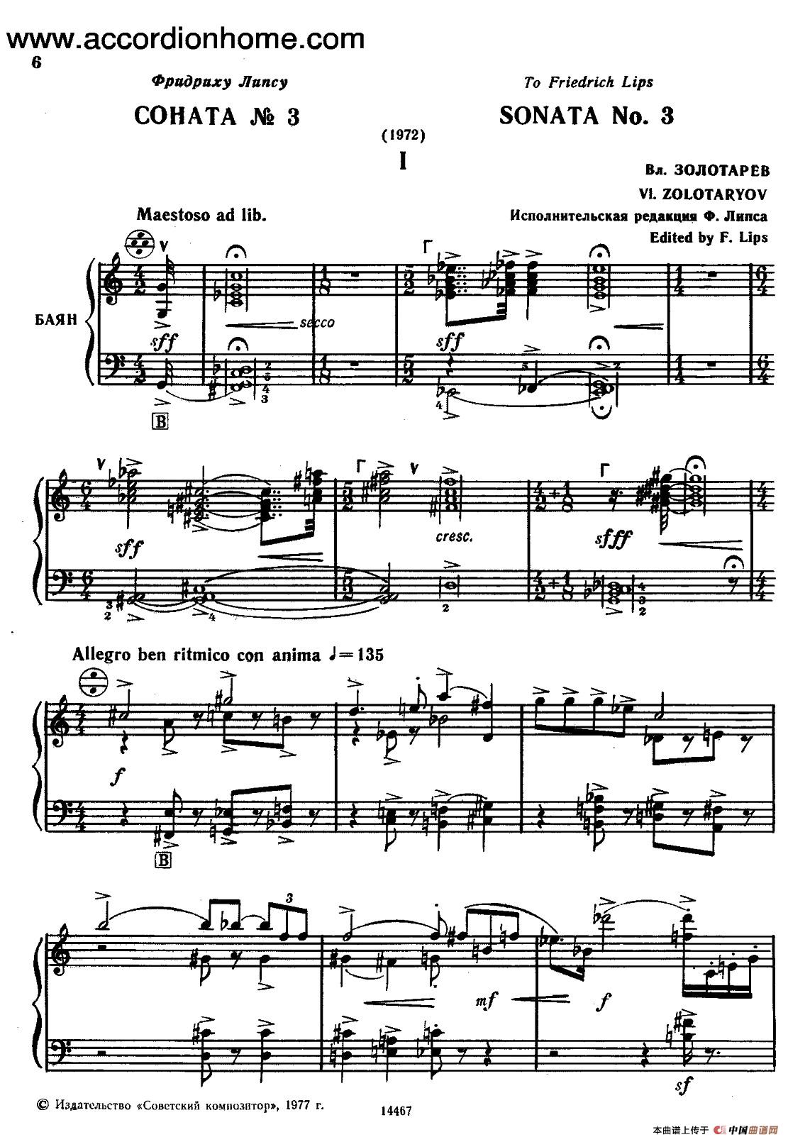温馨提示:想要保存SonateNo.3手风琴简谱,感受奏鸣曲乐章魅力曲谱?在曲谱图片上单击右键,选择"图片另存为...",即可将该曲谱保存到您的电脑本地,想要打印出来?将图片插入到WORD中,调整合适到大小打印即可。