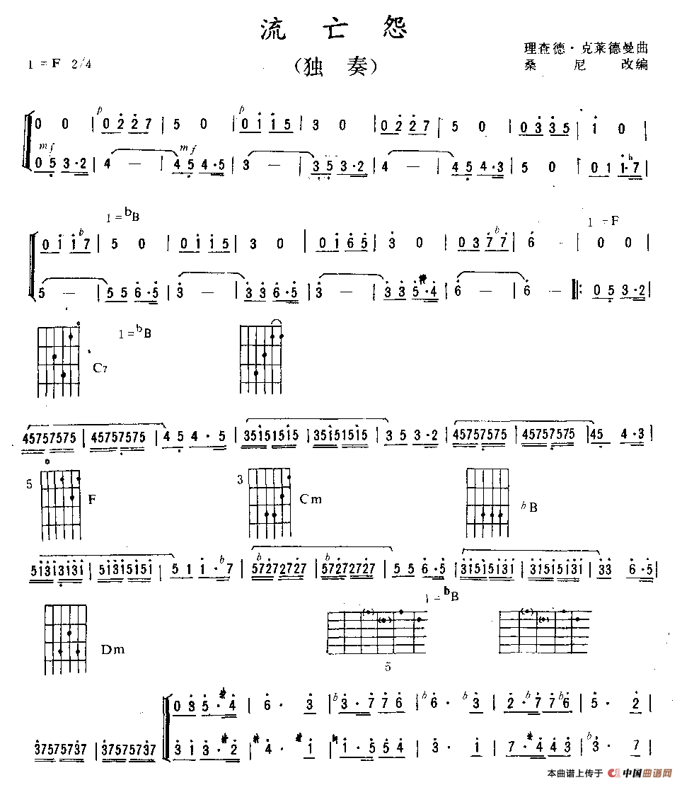 温馨提示:想要保存流亡怨吉他谱,诉哀怨离愁曲谱?在曲谱图片上单击右键,选择"图片另存为...",即可将该曲谱保存到您的电脑本地,想要打印出来?将图片插入到WORD中,调整合适到大小打印即可。