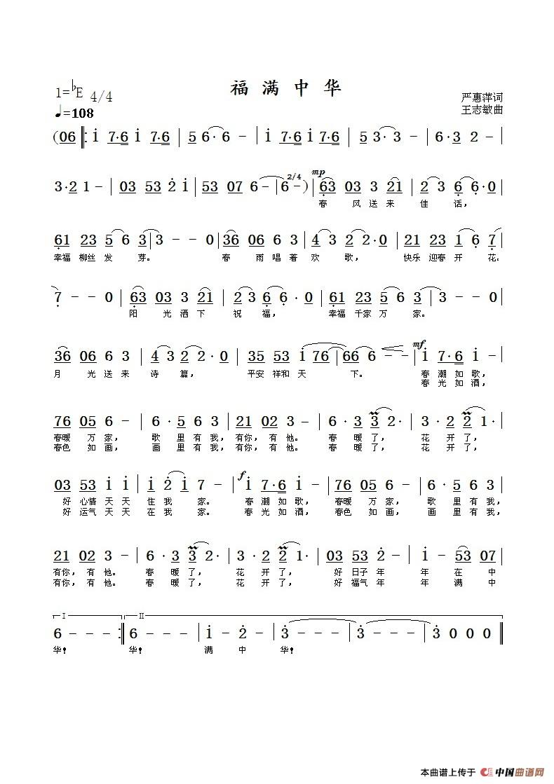 福满中华(严惠萍词 王志敏曲)曲谱是由作词:严惠萍作曲:王志敏,上传:子夜情歌,版权归原作者所有。