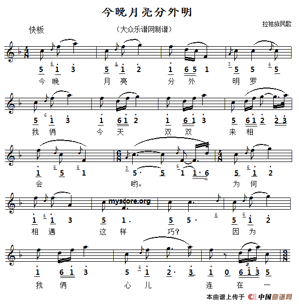 今晚月亮分外明(线简谱对照版)曲谱是由作曲:拉祜族民歌,上传:editor1,版权归原作者所有。