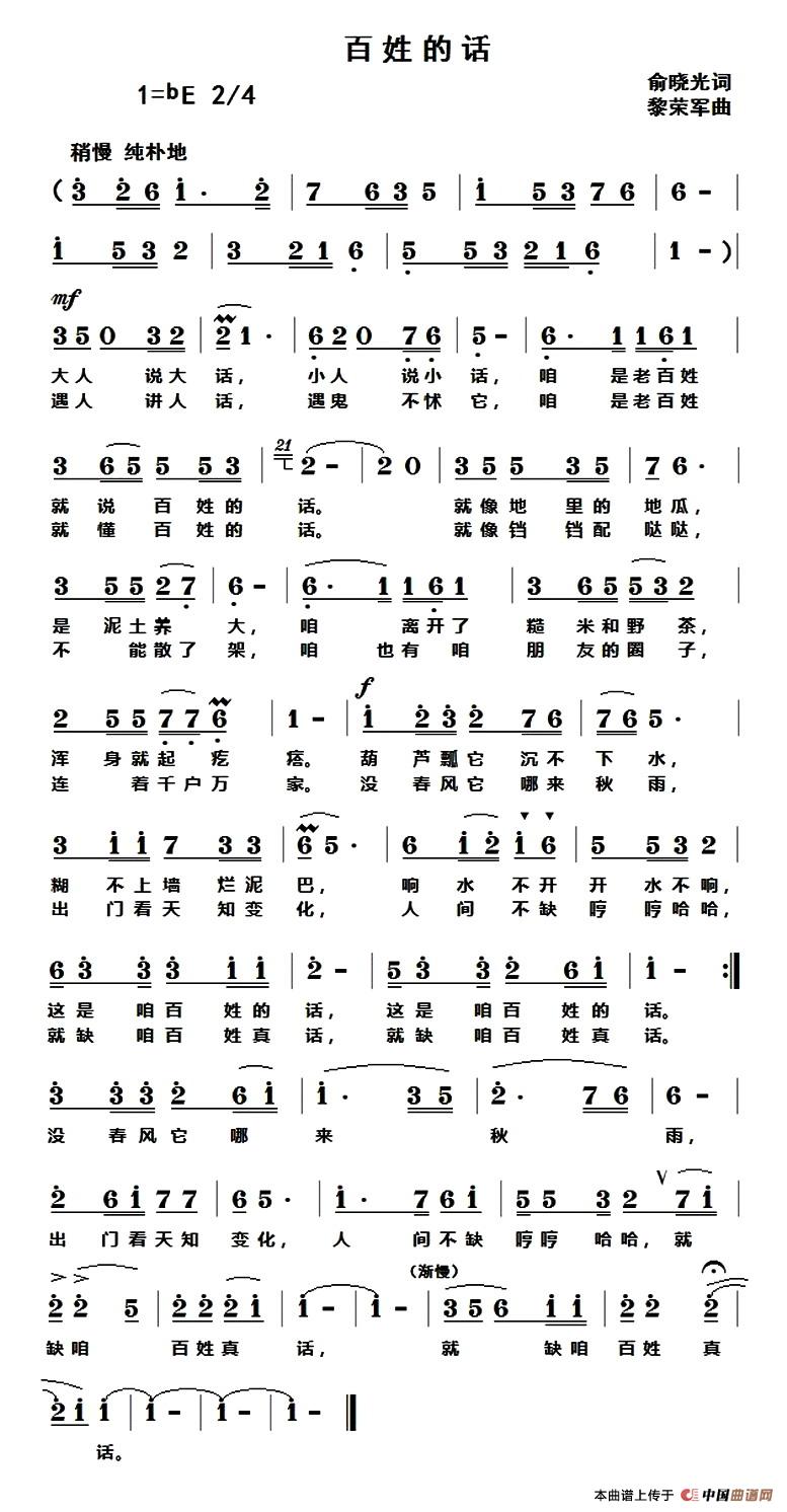 百姓的话(俞晓光词 黎荣军曲)曲谱是由作词:俞晓光作曲:黎荣军,上传:editor1,版权归原作者所有。