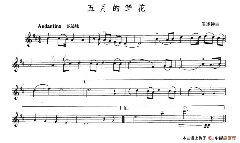 温馨提示:想要保存五月的鲜花提琴简谱, 抒发青春爱国情怀曲谱?在曲谱图片上单击右键,选择"图片另存为...",即可将该曲谱保存到您的电脑本地,想要打印出来?将图片插入到WORD中,调整合适到大小打印即可。