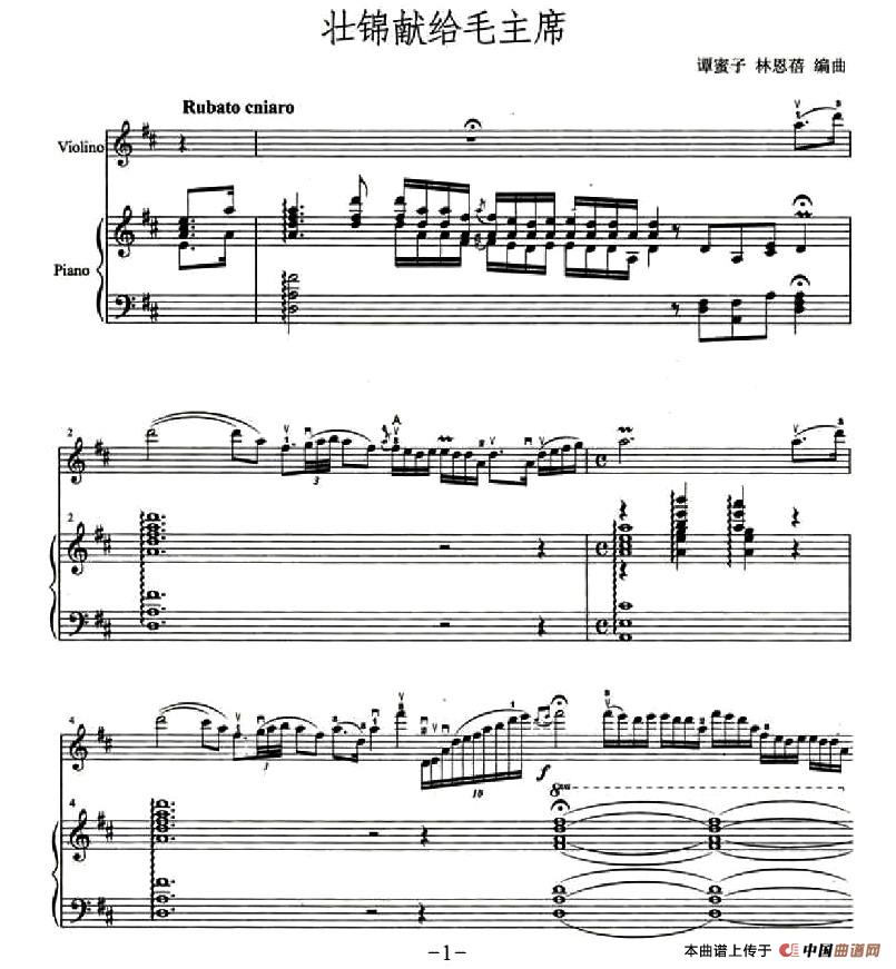 《壮锦献给毛主席(小提琴 + 钢琴伴奏)》是一首饱含深情的乐曲。小提琴悠扬灵动的音色,仿若壮族儿女欢快的舞步,钢琴沉稳的伴奏恰似坚实的大地。乐曲以独特的音乐语言,勾勒出壮族人民丰富多彩的生活场景。壮锦在壮族文化里是智慧与情感的结晶,此曲借“壮锦”这一意象,生动展现了壮族人民对毛主席的崇敬与爱戴。那流畅的旋律,传递出他们想要将最珍贵的东西献给领袖的真挚心意,让听众能深刻感受到少数民族与祖国大家庭之间紧密相连、血浓于水的深厚情谊。