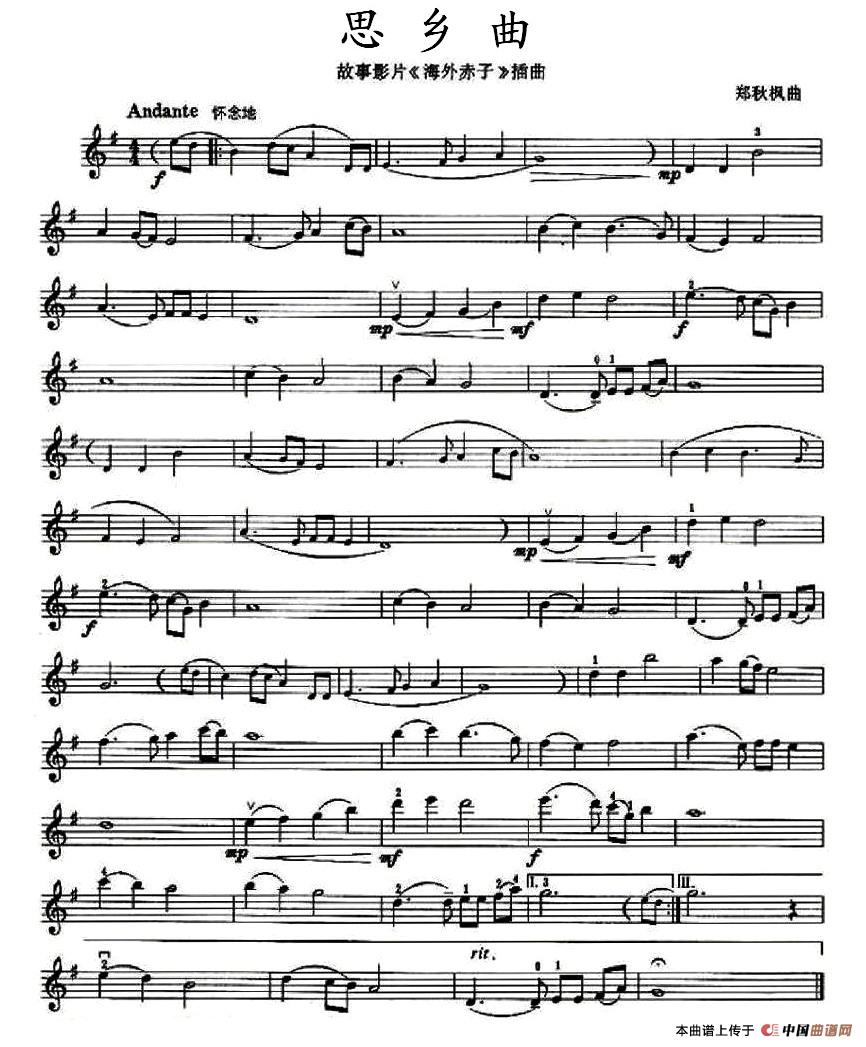温馨提示:想要保存思乡曲(电影海外赤子插曲)提琴简谱,抒发海外游子思乡情曲谱?在曲谱图片上单击右键,选择"图片另存为...",即可将该曲谱保存到您的电脑本地,想要打印出来?将图片插入到WORD中,调整合适到大小打印即可。