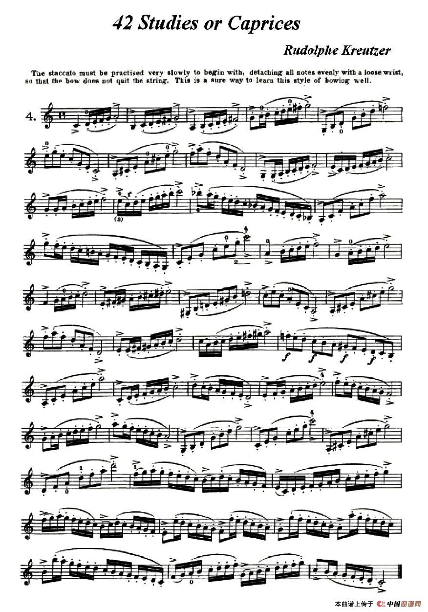 温馨提示:想要保存42首练习曲或隨想曲之四提琴简谱,展现灵动音乐意境曲谱?在曲谱图片上单击右键,选择"图片另存为...",即可将该曲谱保存到您的电脑本地,想要打印出来?将图片插入到WORD中,调整合适到大小打印即可。