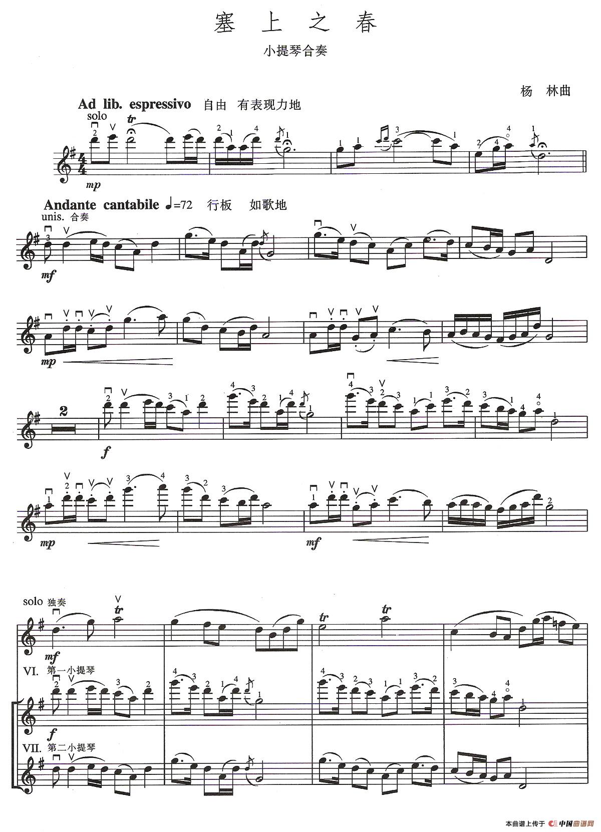 温馨提示:想要保存塞上之春(小提琴合奏)提琴简谱,展现塞外春日美景曲谱?在曲谱图片上单击右键,选择"图片另存为...",即可将该曲谱保存到您的电脑本地,想要打印出来?将图片插入到WORD中,调整合适到大小打印即可。