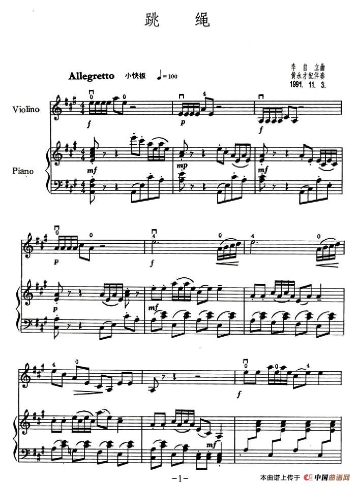 温馨提示:想要保存跳绳(小提琴+钢琴伴奏)提琴简谱,展现活力跳跃之美曲谱?在曲谱图片上单击右键,选择"图片另存为...",即可将该曲谱保存到您的电脑本地,想要打印出来?将图片插入到WORD中,调整合适到大小打印即可。