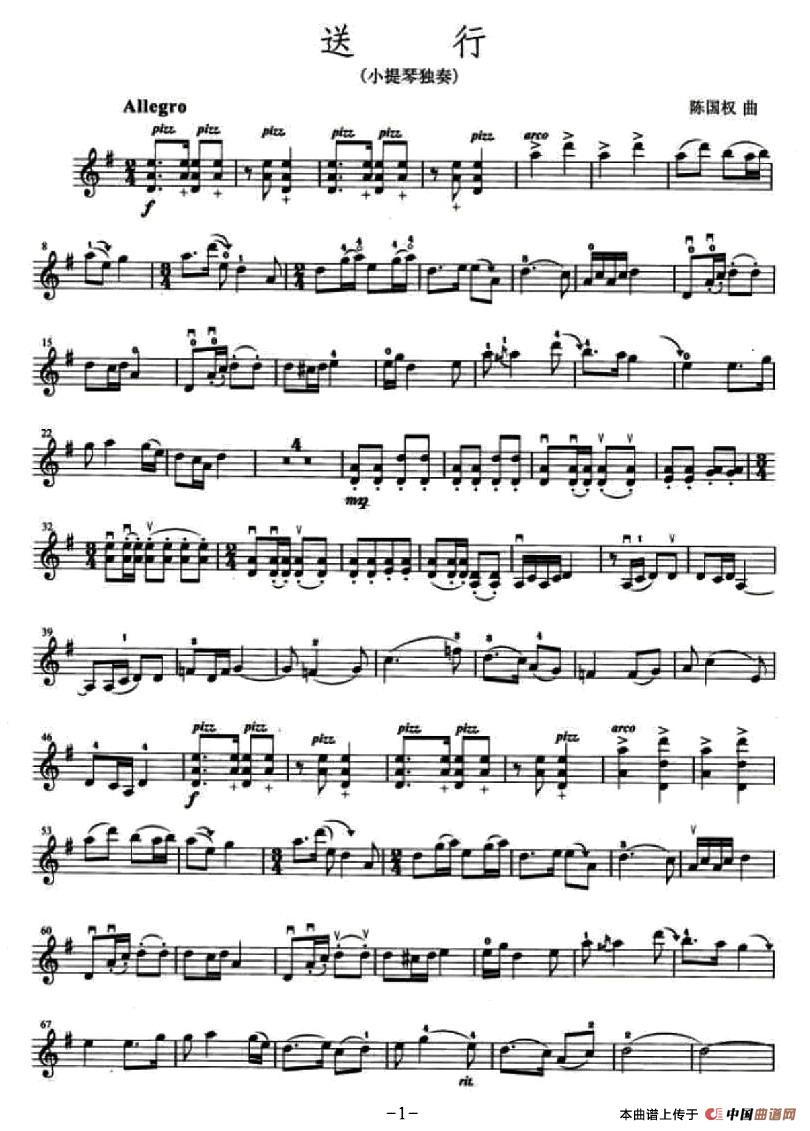 温馨提示:想要保存送行提琴简谱, 传达离别愁绪情曲谱?在曲谱图片上单击右键,选择"图片另存为...",即可将该曲谱保存到您的电脑本地,想要打印出来?将图片插入到WORD中,调整合适到大小打印即可。