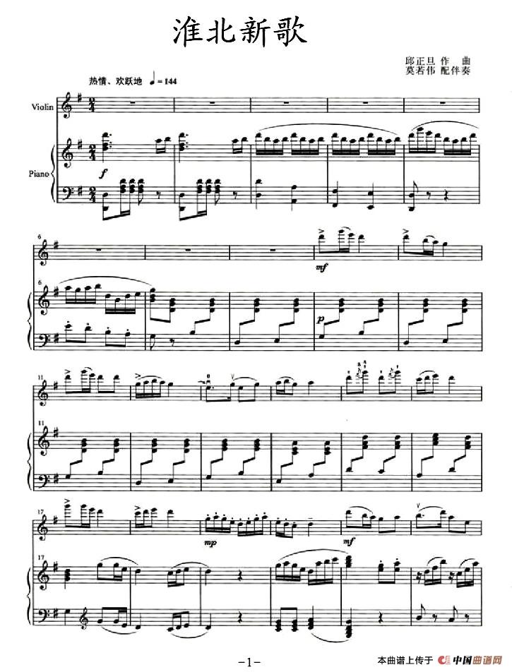 温馨提示:想要保存淮北新歌(小提琴+钢琴伴奏)提琴简谱,展现淮北新貌风情曲谱?在曲谱图片上单击右键,选择"图片另存为...",即可将该曲谱保存到您的电脑本地,想要打印出来?将图片插入到WORD中,调整合适到大小打印即可。