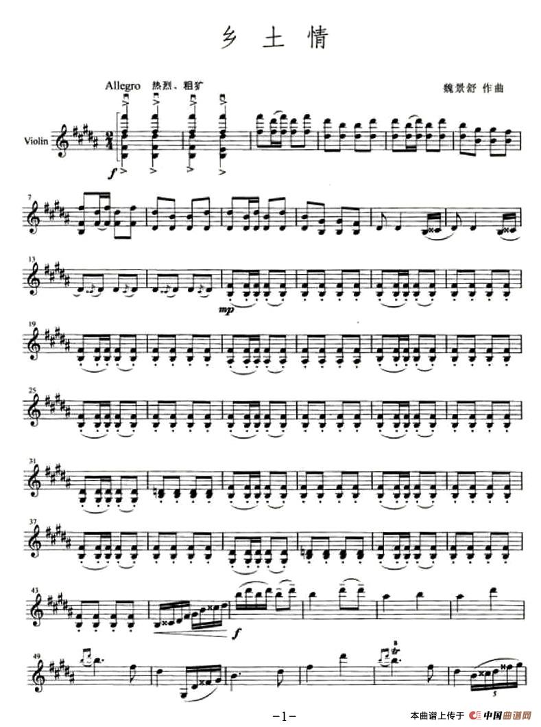 温馨提示:想要保存乡土情提琴简谱, 抒发浓郁故乡情思曲谱?在曲谱图片上单击右键,选择"图片另存为...",即可将该曲谱保存到您的电脑本地,想要打印出来?将图片插入到WORD中,调整合适到大小打印即可。
